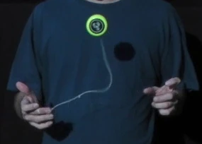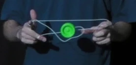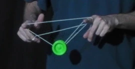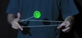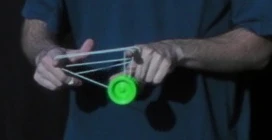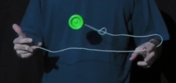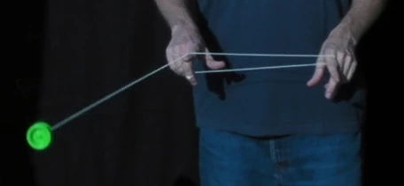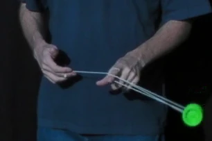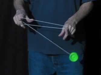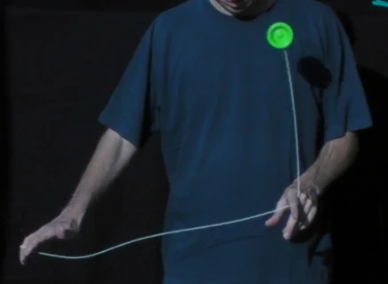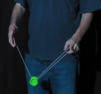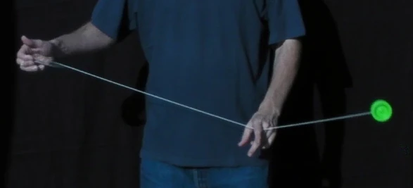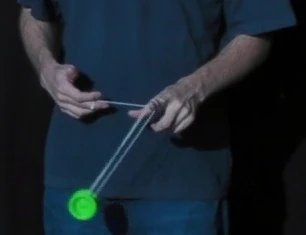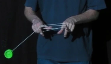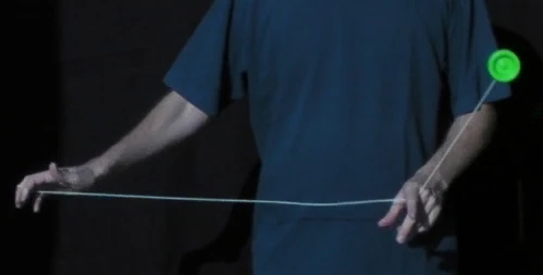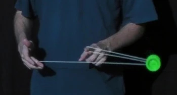 Step 4: ...and when it comes around, give it a little string by moving your hands closer together. The image shows how the segment between the two hands is not really taut here. This lets the yo-yo continue almost freely in a parabolic trajectory. | |