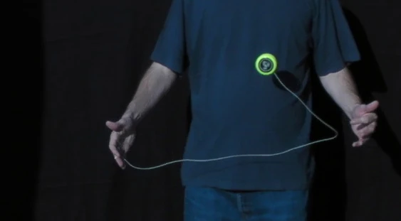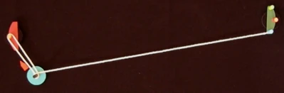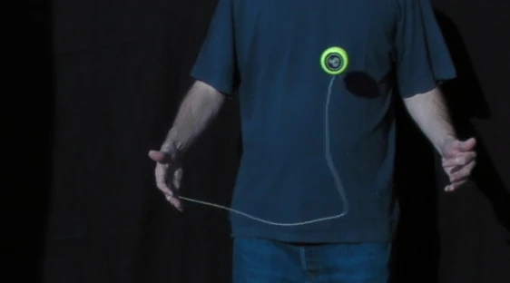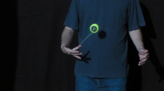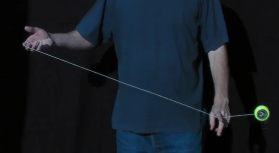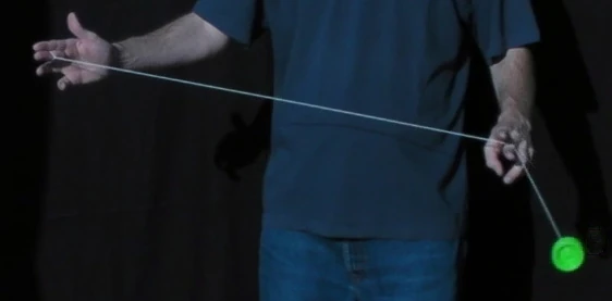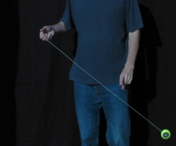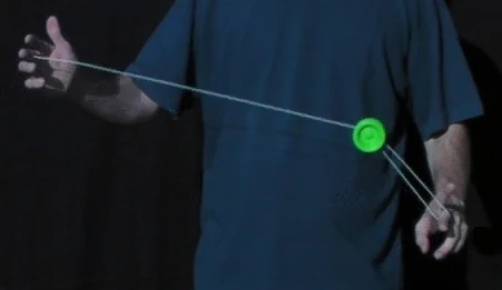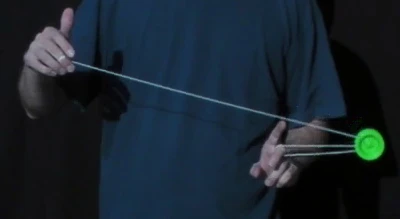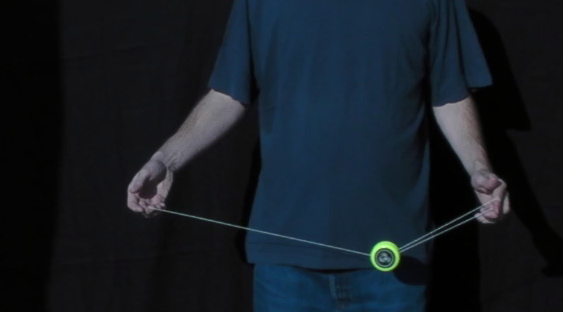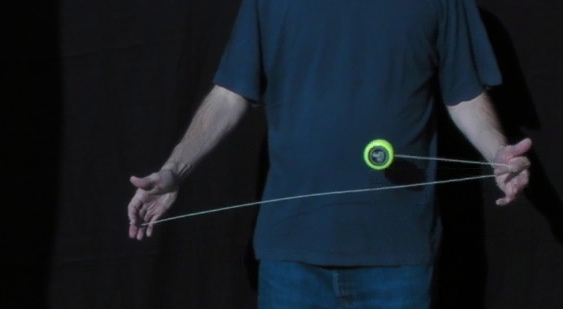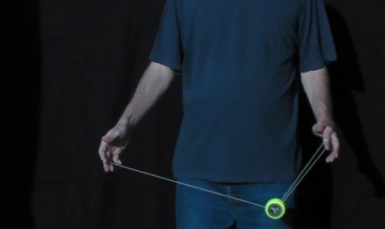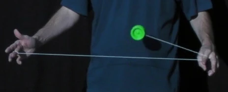 A variation on the trapeze is the Reverse Trapeze. Here, even though it looks like a trapeze, the yo-yo does not lie on the string, but is hanging in a loop of string wound around the axle. As the string winding requires space, it is recommended to only try this with a wide gapped yo-yo. The Reverse Trapeze is a basic ingredient in Binding. | |